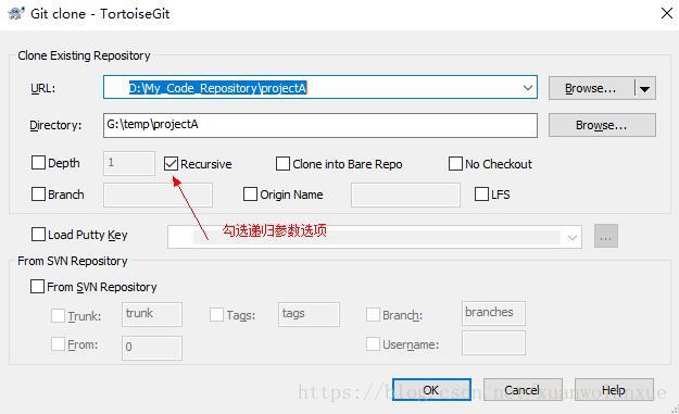 在clone时也是一样的,它既可以只是clone,然后用上面菜单中,Submodule Update 选项来抓取子模块的内容,也可以在clone时选择递归参数,如下所示: