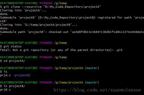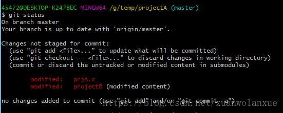 就这么简单的一句git命令就可以搞定了,当然这还没完,运行完这个命令之后,在projectA目录执行git status命令,可以看到如下的结果: