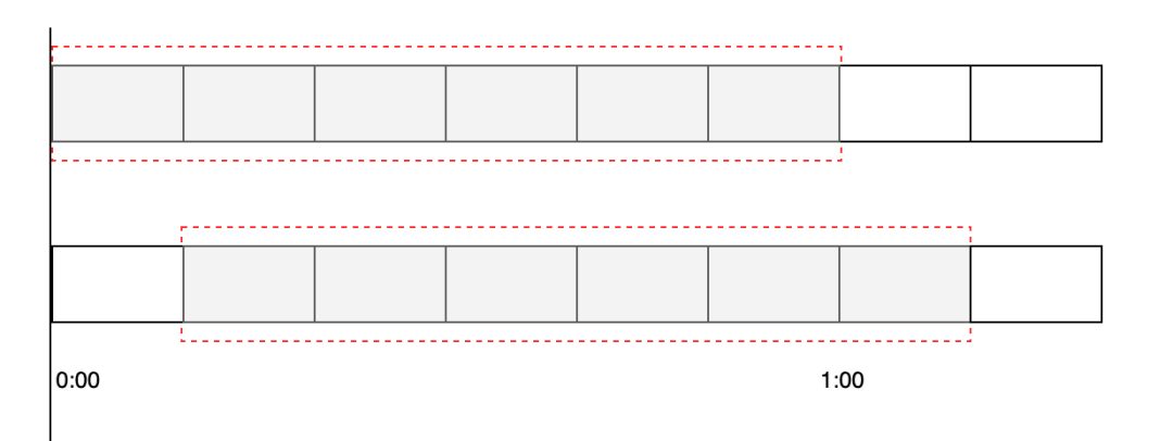 其中每一小个表示 10s,被红色虚线包围的时间段则为需要判断的时间间隔,比如 60s 秒允许 100 次请求,那么红色虚线部分则为 60s。