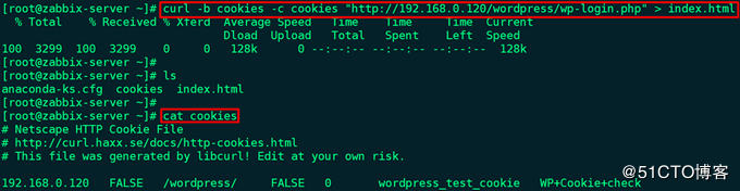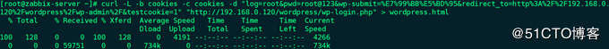 # curl -L -b cookies -c cookies -d "log=rootpwd=root@123wp-submit=%E7%99%BB%E5%BD%95redirect_to=http%3A%2F%2F192.168.0.120%2Fwordpress%2Fwp-admin%2Ftestcookie=1" "http://192.168.0.120/wordpress/wp-login.php" > wordpress.html