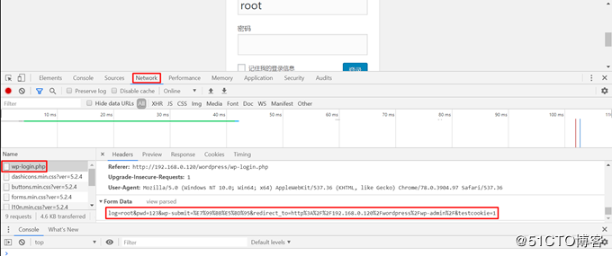 取出“log=rootpwd=root@123wp-submit=%E7%99%BB%E5%BD%95redirect_to=http%3A%2F%2F192.168.0.120%2Fwordpress%2Fwp-admin%2Ftestcookie=1”,并替换为正确的密码