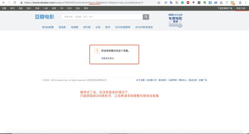 为什么我们之前的案例(京东、优酷等)中不需要登录,而今天爬取豆瓣需要登录呢?那是因为豆瓣在没有登录状态情况下只允许你查看前200条影评,之后就需要登录才能查看,这也算是一种反扒手段!