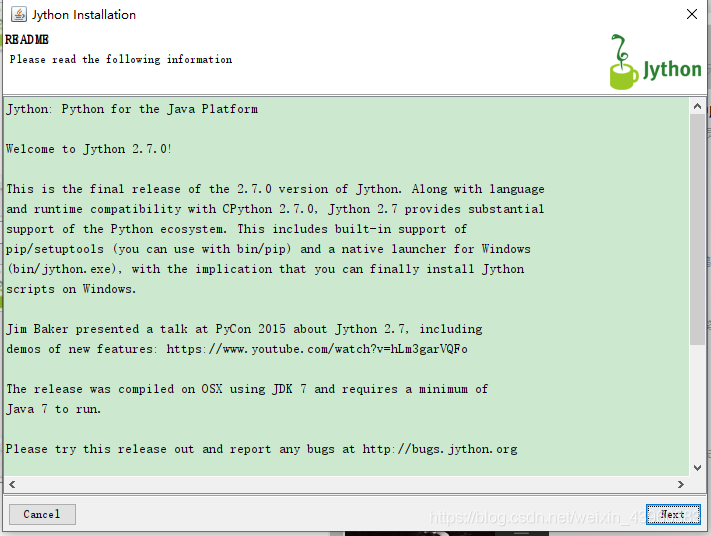首先确定已安装好了 Java双击下载完成的 Jython 安装包(我下载的是Jython 2.7.0)