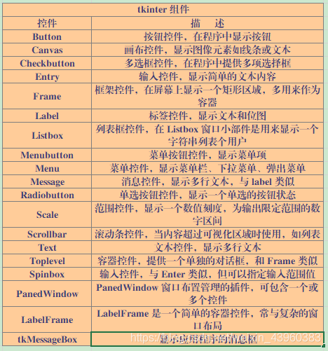 tkinter 提供了各种控件,如下所示: