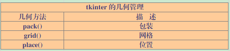 tkinter 控件有特定的集合状态管理方法,管理整个控件区域组织,下表所示: