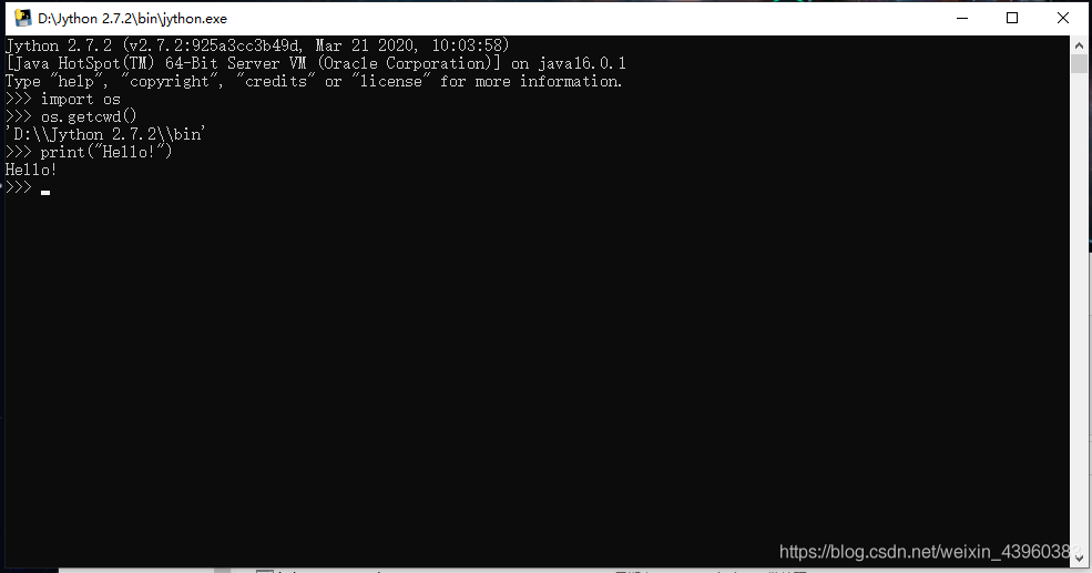 输入 Python 语句,看是否安装成功(Jython 程序也可以运行 Python代码)