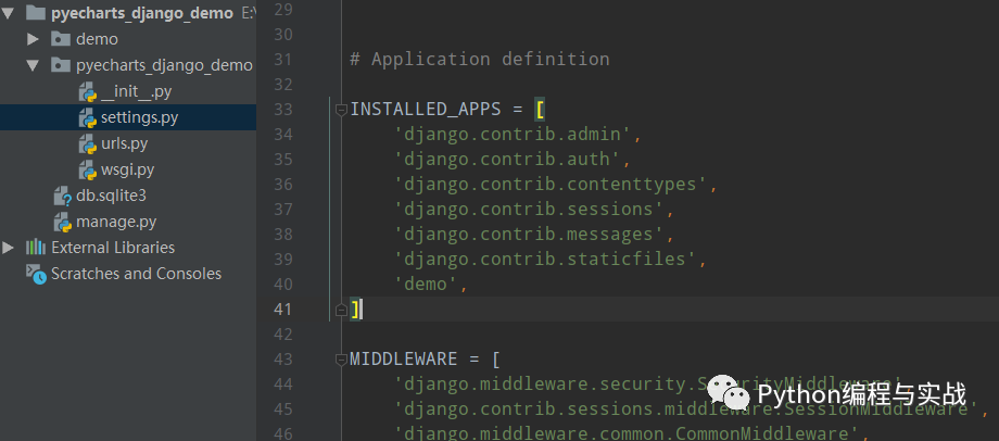 同时在pyecharts_django_demo/settings.py中注册应用程序INSTALLED_APPS中添加应用程序demo