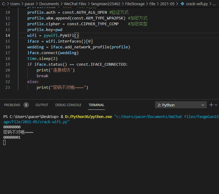 使用pywifi模块,将wifi名称、密码配置进去,进行尝试。