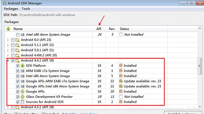 3.勾选你要下载的API版本和对应的android版本,后面模拟器会用到(不下载用其它模拟器也行,或者真机),然后坐等下载