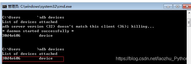 ,当屏幕上出现一串字符,后面显示devices说明连接成功(出现其它的提示,得检查自己的环境了)
