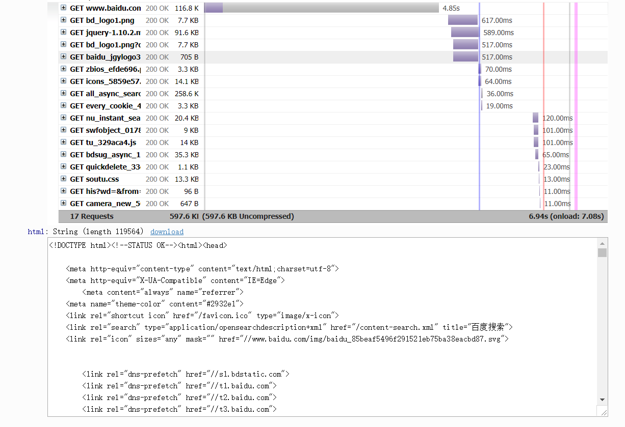 从HAR中可以看到,Splash执行了整个页面的渲染过程,包括CSS、JavaScript的加载等,通过返回结果可以看到它分别对应搜索框下面的脚本文件中return部分的三个返回值,html、png、har: