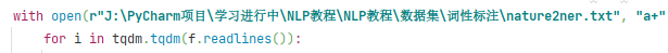 with open(r"J:\PyCharm项目\学习进行中\NLP教程\NLP教程\数据集\词性标注\nature2ner.txt","a+",encoding="utf-8")as f_: