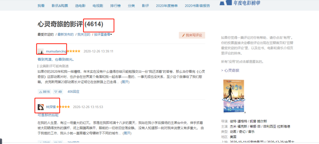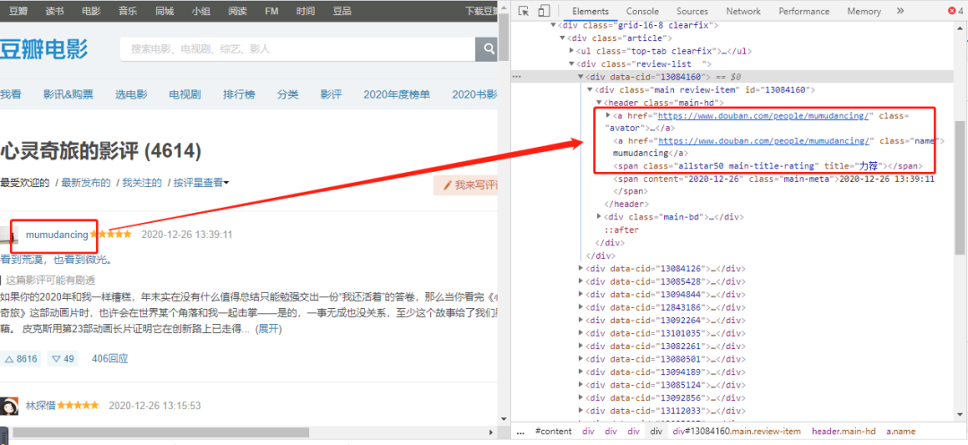 为了获取用户,我选择了其中一部电影的影评,这样可以根据评论的用户去获取其用户名称(后面爬取用户观影记录只需要『用户名称』)。