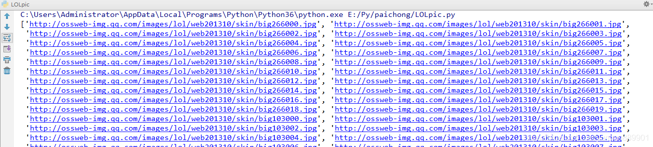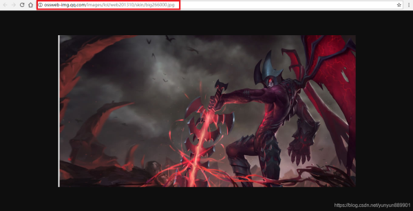 4.图中红色框就是我们需要的图片地址,经过分析知道:每一个英雄及皮肤的地址只有编号不一样(http://ossweb-img.qq.com/images/lol/web201310/skin/big266000.jpg),而该编号有6位,前3位表示英雄,后三位表示皮肤。刚才找到的js文件中恰好有英雄的编号,而皮肤的编码可以自己定义,反正每个英雄皮肤不超过20个,然后组合起来就可以了。