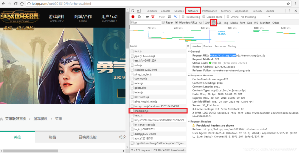 2.从上面网址可以看到所有英雄都在,按下F12查看源代码,发现英雄及皮肤图片并没有直接给出,而是隐藏在JS文件中。这时候需要点开Network,找到js窗口,刷新网页,就看到一个champion.js的选项,点击可以看到一个字典——里面就包含了所有英雄的名字(英文)以及对应的编号。