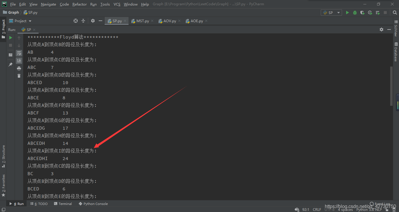 这里只看了一条,就是从顶点 A A A到顶点 I I I的路径,可以看到 D i j k s t r a Dijkstra Dijkstra算法和 F l o y d Floyd Floyd算法求得的最短路径都是24。