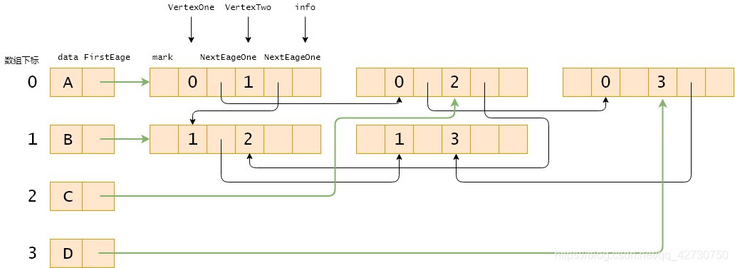 边结点包含mark域、VertexOne域、NextEdgeOne域、VertexTwo域、NextEdgeTwo域和info域,其中mark域用于标记当前是否被访问,VertexOne域和VertexTwo域分别存储当前边的两个顶点在数组中的下标,NextEdgeOne域指向与VertexOne域对应的顶点相关联的下一条边,NextEdgeTwo域指向与VertexTwo域对应的顶点相关联的下一条边,info域存储当前边的其他信息。