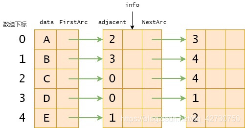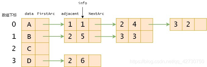 第二部分为用一个结点来存储图中的每一条边或弧,该结点由adjacent域、info域和NextArc域组成,这些结点形成了单链表。这部分结点可以这样定义: