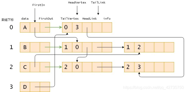 顶点结点包含data域、FirstIn域和FirstOut域,其中data域存储顶点的值,FirstIn域指向以当前顶点为弧头的第