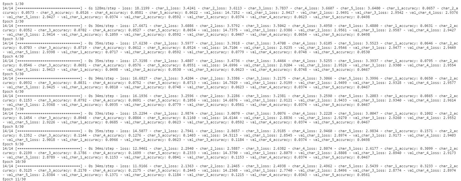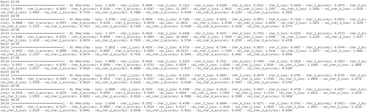 11/11 [==============================] - 0s 11ms/step - loss: 0.7246 - char_1_loss: 0.0682 - char_2_loss: 0.1066 - char_3_loss: 0.2730 - char_4_loss: 0.2636 - char_5_loss: 0.0132 - char_1_accuracy: 0.9844 - char_2_accuracy: 0.9657 - char_3_accuracy: 0.9408 - char_4_accuracy: 0.9626 - char_5_accuracy: 0.9938