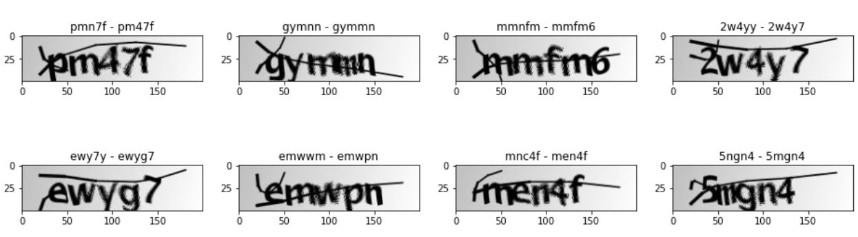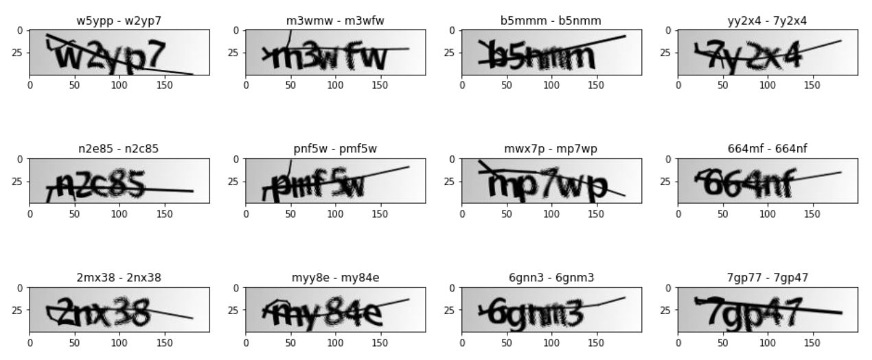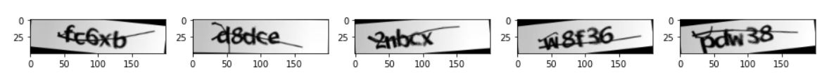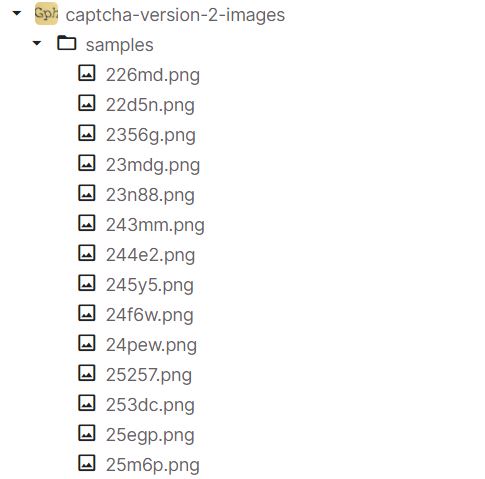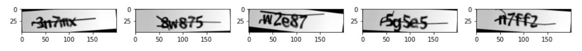 图片是5个字母的单词,可以包含数字。这些图像应用了噪声(模糊和一条线)。它们是200 x 50 PNG。我们的任务是尝试制作光学字符识别算法的模型。