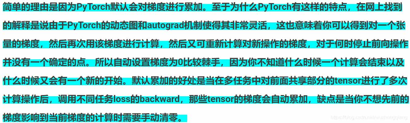 这次主要是记录一下,pytorch在进行反向传播计算梯度的时候的累加机制到底是什么样子? 至于为什么采用这种机制,我也搜了一下,大部分给出的结果是这样子的: