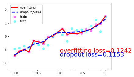 plt.text(0, -1.5, 'dropout loss=%.4f' % loss(test_pred_drop, test_y).data.numpy(), fontdict={'size': 20, 'color': 'blue'})