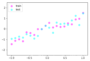 plt.scatter(x.data.numpy(), y.data.numpy(), c='magenta', s=50, alpha=0.5, label='train')