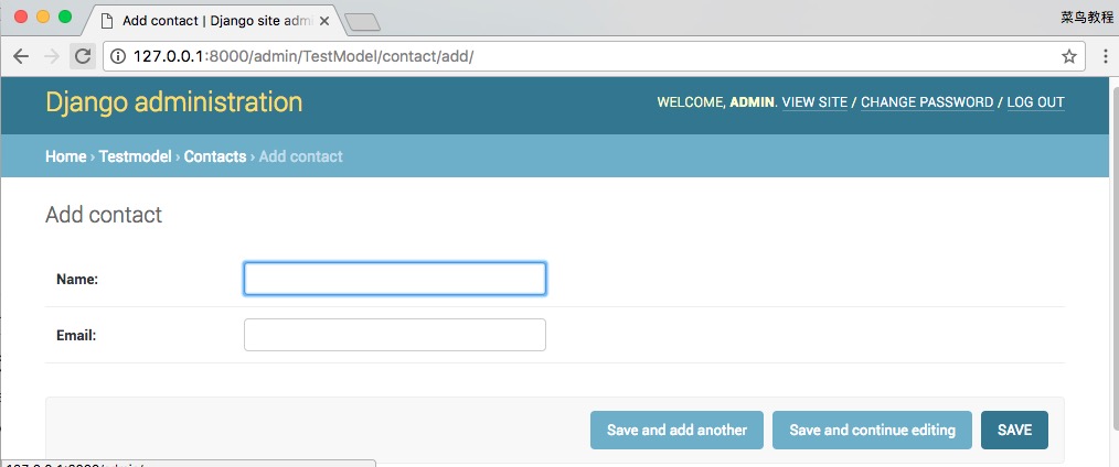 我们可以自定义管理页面,来取代默认的页面。比如上面的 “add” 页面。我们想只显示 name 和 email 部分。修改 TestModel/admin.py: