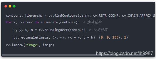 找出所有的轮廓,并用红色线框将其绘制标识出来了,看出来大大小小有几十个轮廓