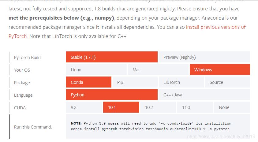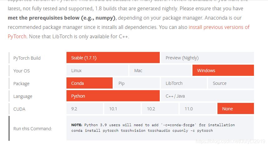 之后进入官网https://pytorch.org/找到合适的版本,如果你是安装cpu版