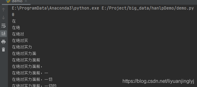算法的原理:首先通过while循环判断i是否超出了字符串的大小,如果没有,获取当前第一个字符串为第一个最长匹配结果,接着遍历第一个字符串的所有可能组合结尾,如果在字典中,判断当前词语是否大于前面的最长匹配结果,如果是替换掉最长。遍历完成之后,将最长的结果添加到列表中,然后再获取第二字符,遍历所有结尾组合,获取最长匹配。以此类推。