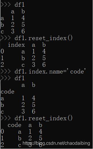 如上图,如果直接reset_index,index列变成普通列,但是列头自动变成了index,这可不好,所以先给index列赋值,也就是df1.index.name=‘code'