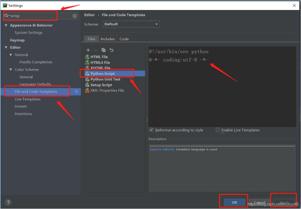2.搜索temlates,点击File and Code Templates,点击右侧的Python Script ,在右侧输入,在右下角点击应用,确定。