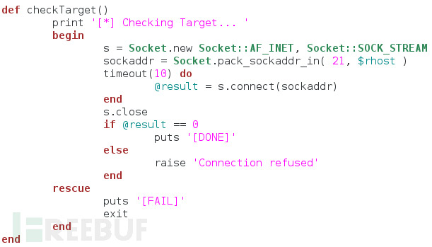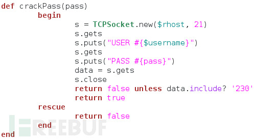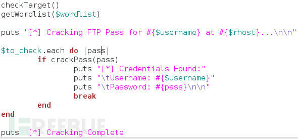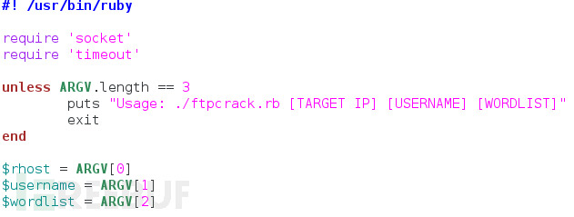 这里我们将会使用到Ruby脚本,来构建我们的FTP密码破解器。如果你不是很了解Ruby脚本,不用担心,我已经为大家准备了 Ruby的基础教程 ,该教程涵盖了本文中所用到的一些Ruby基础知识,因此我建议大家在阅读本文之前,先去掌握一些Ruby的基础知识,以便更好地阅读本文。下面我们直接进入代码部分。
