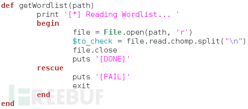 以上代码我们简单的使用了socket库并丢了个IP地址,来建立与目标服务器的通信连接。同时,我们使用了timeout库做了一个十秒钟的超时循环,如果连接在十秒内未完成,脚本将会在客户端界面提示用户并关闭脚本。有了这些基本的功能后,下面我们使用以下函数来读取用户的字典列表文件: