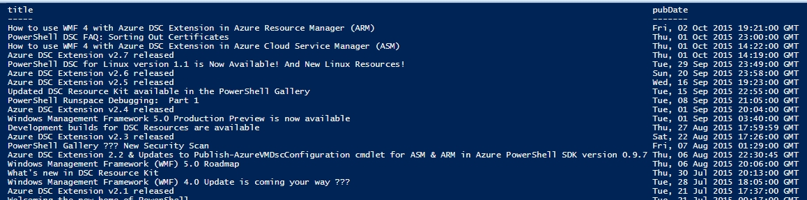 [xml]$a= Invoke-WebRequest -Uri "http://blogs.msdn.com/b/powershell/rss.aspx“$a.rss.channel.Item | select title,pubdate