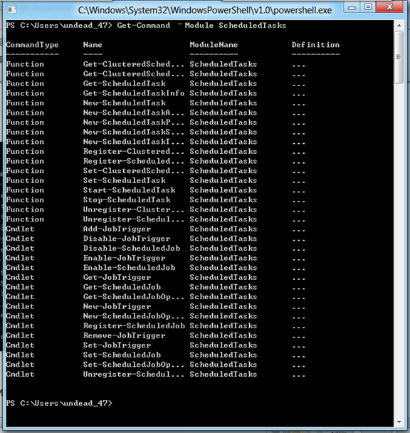 查看ScheduledTasks模块包含的所有命令:Get-Command –Module ScheduledTasks