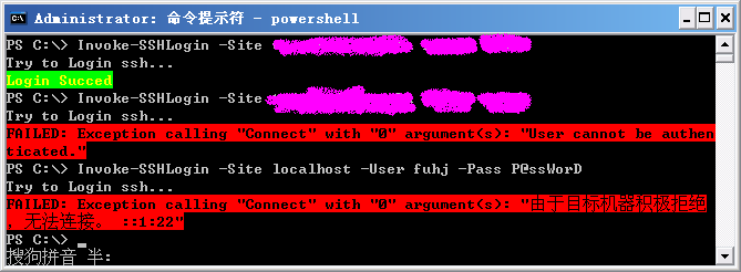 在PSNet程序集中继续进行扩展,在$env:PSSpace/PSNet/TCPOp/下创建Invoke-SSHLogin.ps1脚本用于在传入指定ssh地址、用户名和密码后返回是否登录成功。