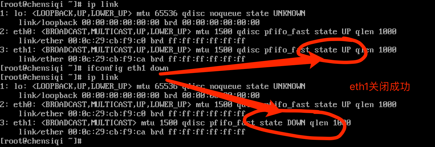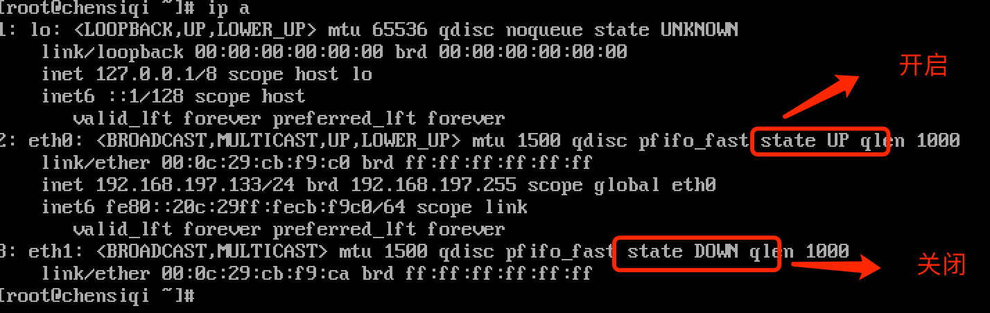 ifconfig 网卡名 up/down:直接关闭和开启网卡设备。
