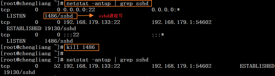 当我远程用CRT执行命令kill 1486进程后,只剩下当前CRT连接Linux的sshd进程(Pid=19130)。即 我若想在CRT再开一个会话连接Linux,是绝对连不上的。