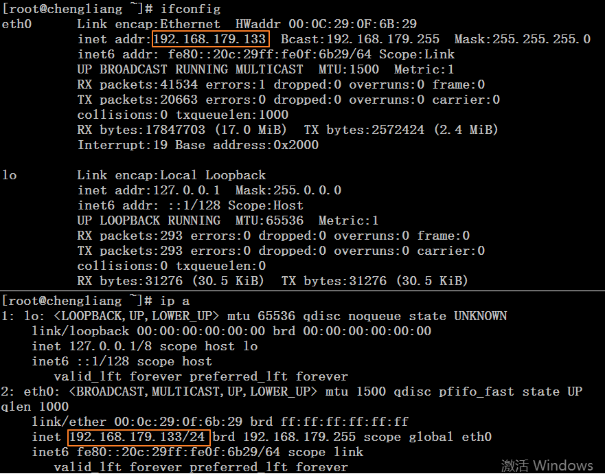 ifconfig + 网卡名:可以查看开启状态的网卡的IP地址(看不到关闭状态的网卡设备)