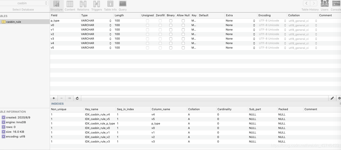 初始化环境后,系统会在你选择的数据库自动生成一个casbin_rule的数据库表