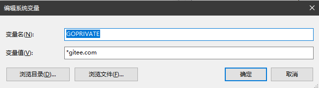 系统环境变量中加入GOPRIVATE变量,值为要过滤的私有地址,如*gitee.com。此处配置作用是通过代理拉取module时过滤掉码云的地址,不通代理拉取私有仓库地址。