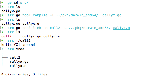 ➜ src go tool link -o call2 -L ../pkg/darwin_amd64/ callyx.o