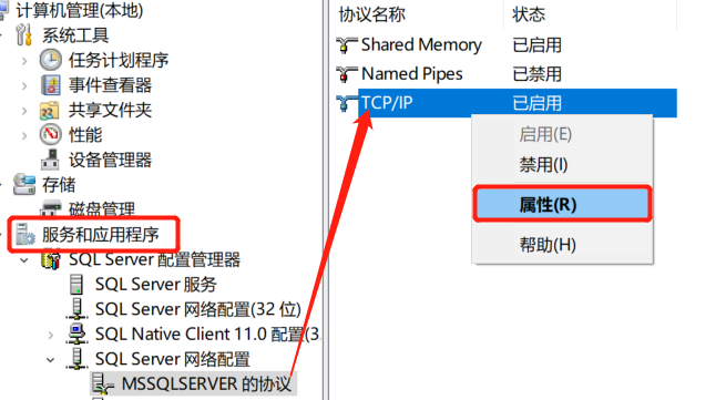 找到服务和应用程序,然后配置sqlserver网络协议,启用TCP/IP,右击属性,如图: