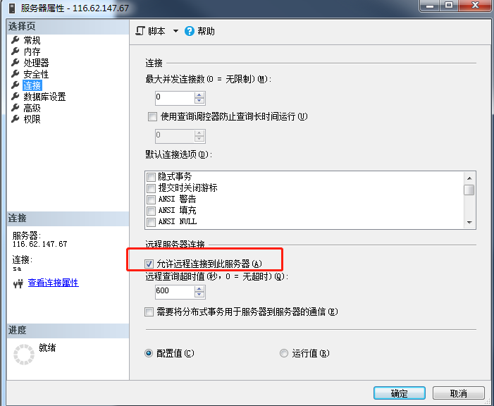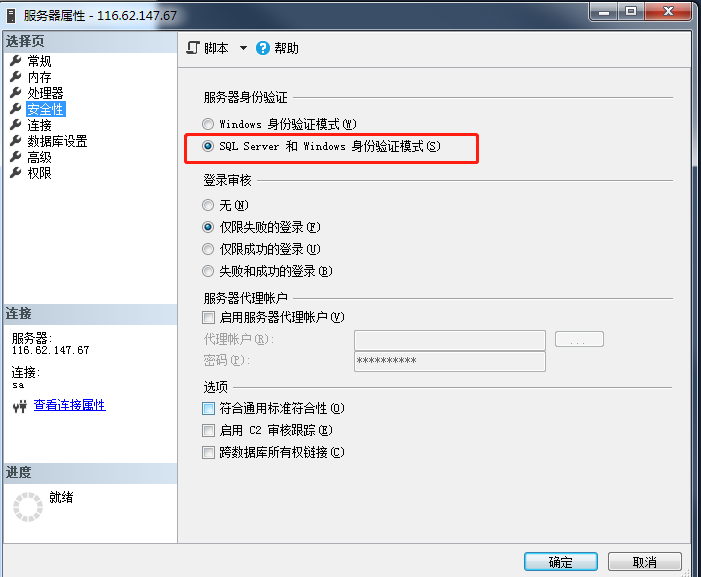 登录成功之后,右键打开属性,在安全性选项卡勾选sql server和windows身份认证模式,在连接选项卡勾选允许远程连接到此服务器,如下图: