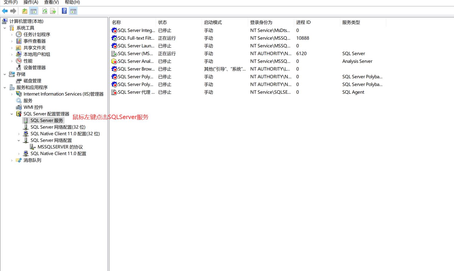 7、在计算机管理页面-》鼠标左键点击SQLServer服务。