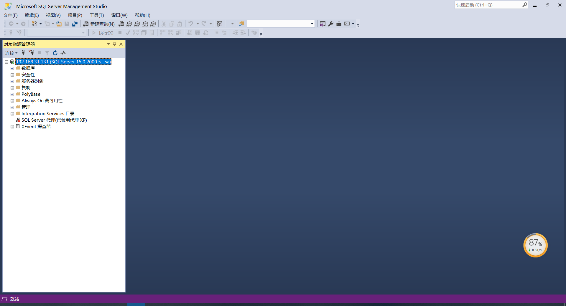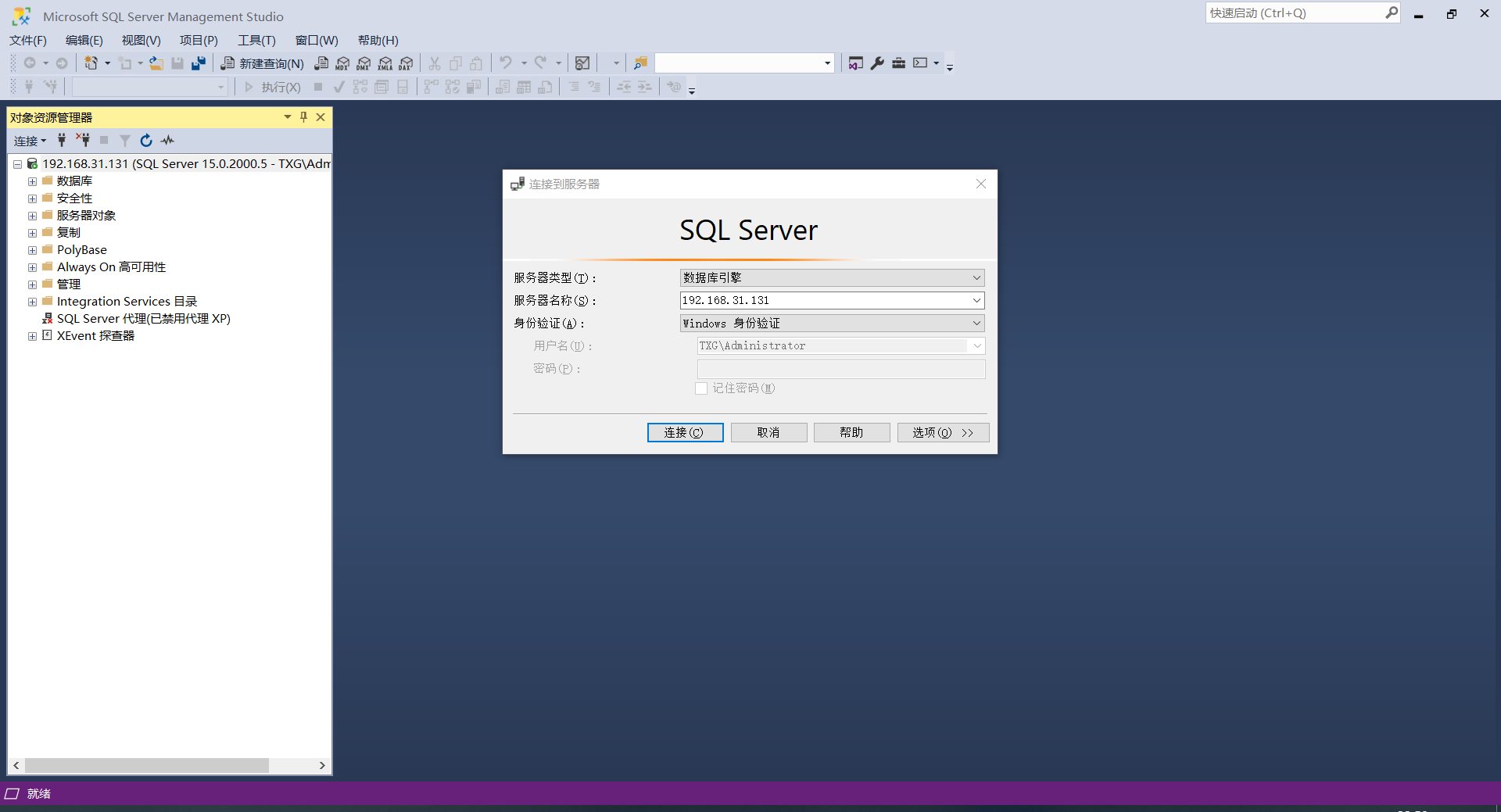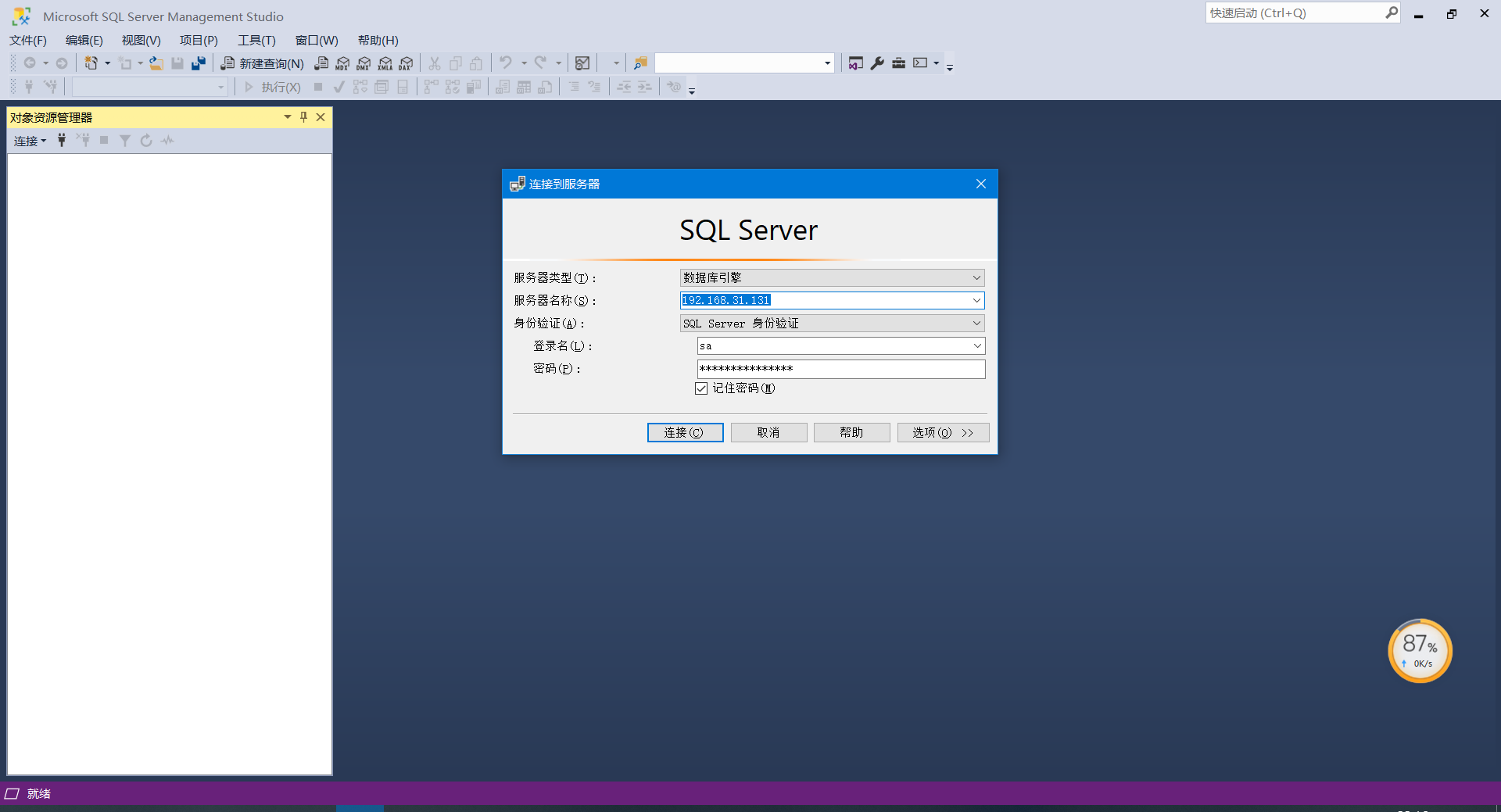 10、打开SSMS数据库管理工具-》在服务器名称中输入IP地址-》身份验证选择SQLServer身份验证-》输入登录名和密码-》点击连接。